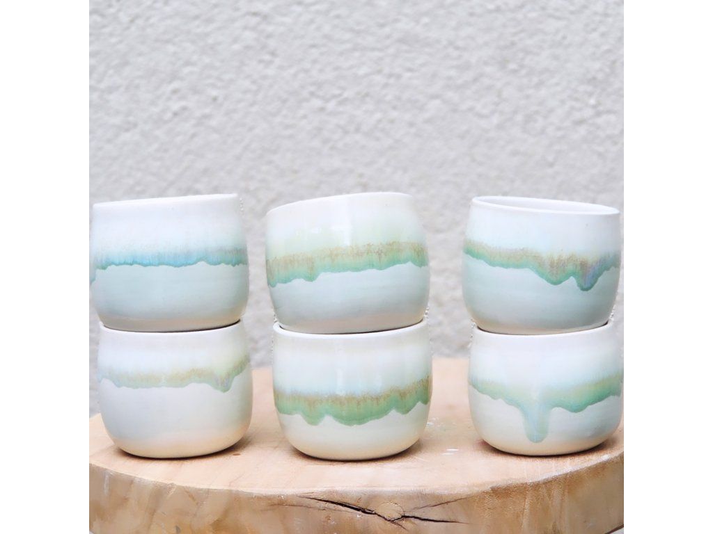 Kalíšek má objem cca 200 ml a byl točen z jemné kameniny. Vznikal volně na hrnčířském kruhu a byl pálený na vysoké teploty v elektrické peci. Právě díky vyšší teplotě výpalu smí do myčky.