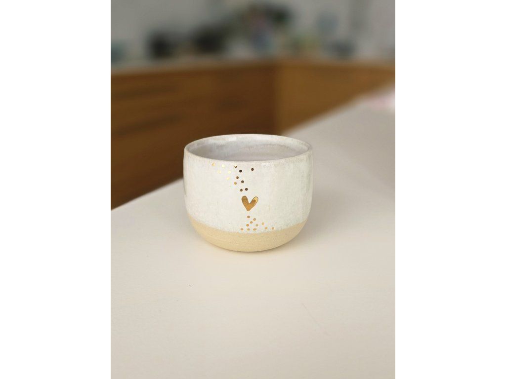 Kalíšek má objem cca 150 ml a byl točen z jemné kameniny. Vznikal volně na hrnčířském kruhu a byl pálený na vysoké teploty v elektrické peci. Kvůli aplikaci zlata doporučujeme ruční mytí.