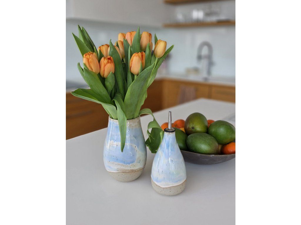 Keramická váza vznikala na volně na hrnčířském kruhu. Pálena v elektrické peci na vysoké teploty.